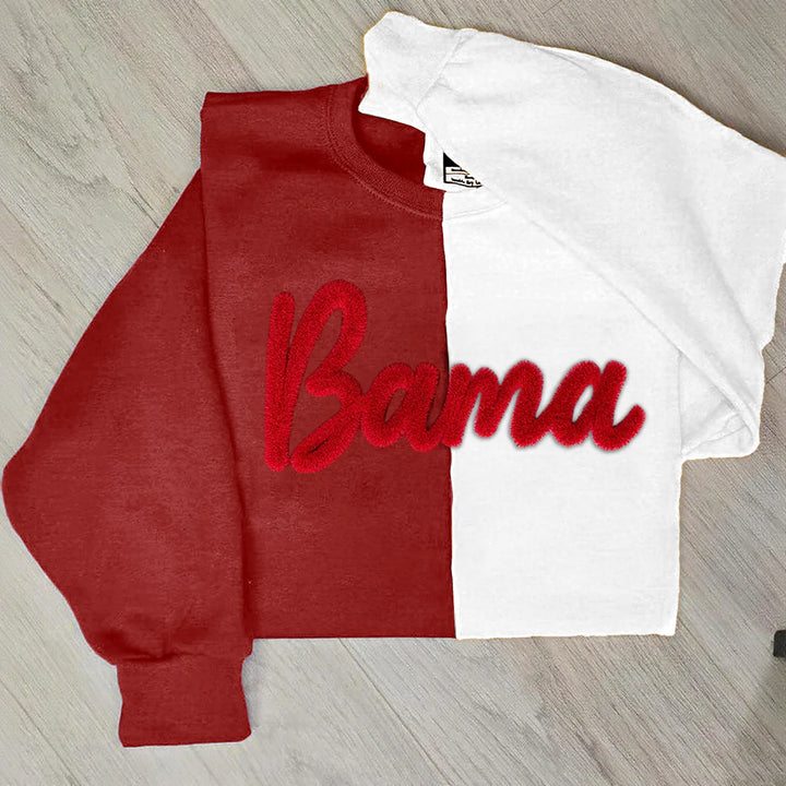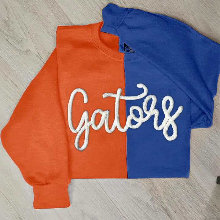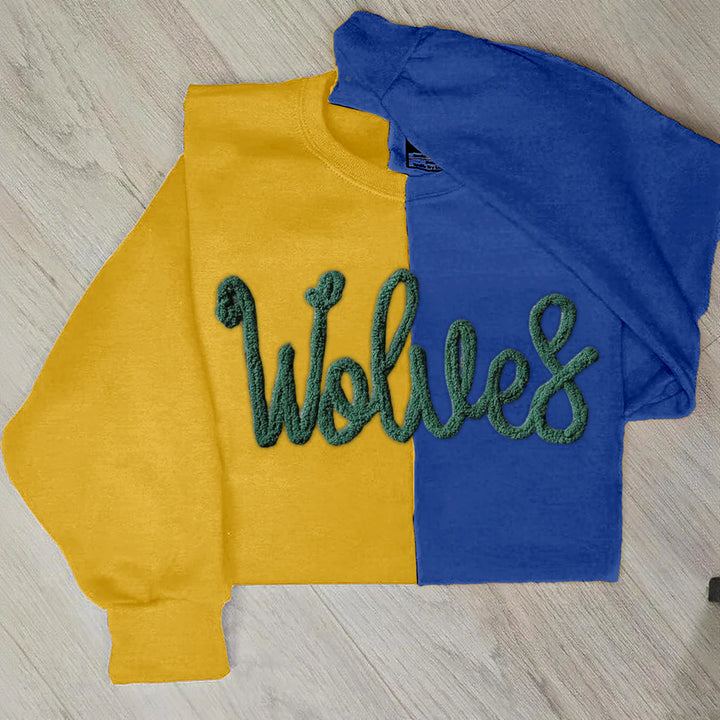 Custom Chenille Yarn Embroidered Two Tone Sweatshirt School Mascot Split Sweatshirt