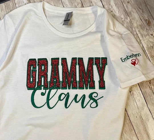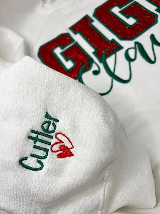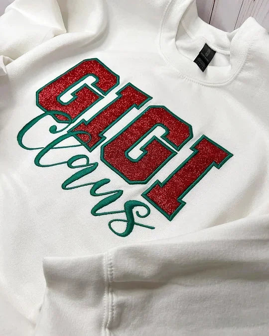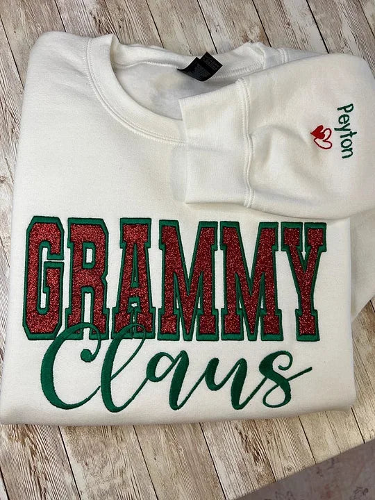 Custom Embroidered Glitter Gigi Mimi Mama Claus Sweatshirt with Names on Sleeve