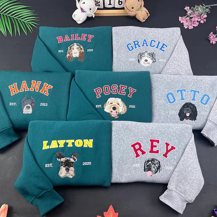 Celebrate your furry friends with these custom embroidered dog portrait sweatshirts! Each sweatshirt is personalized with a dog's portrait, their name, and the year they were established, creating a unique and heartwarming tribute to your pet. Perfect for any dog lover, these sweatshirts combine style, comfort, and love for your four-legged companions.