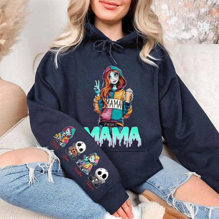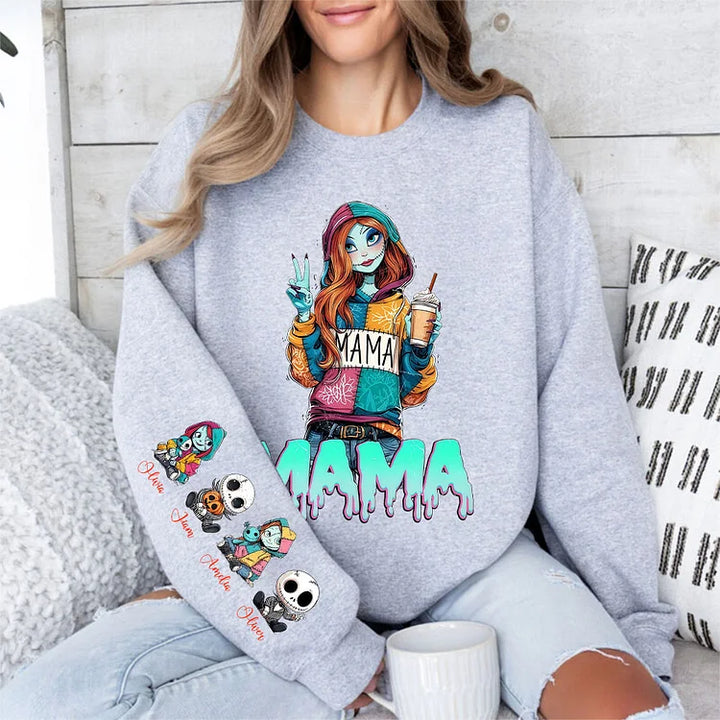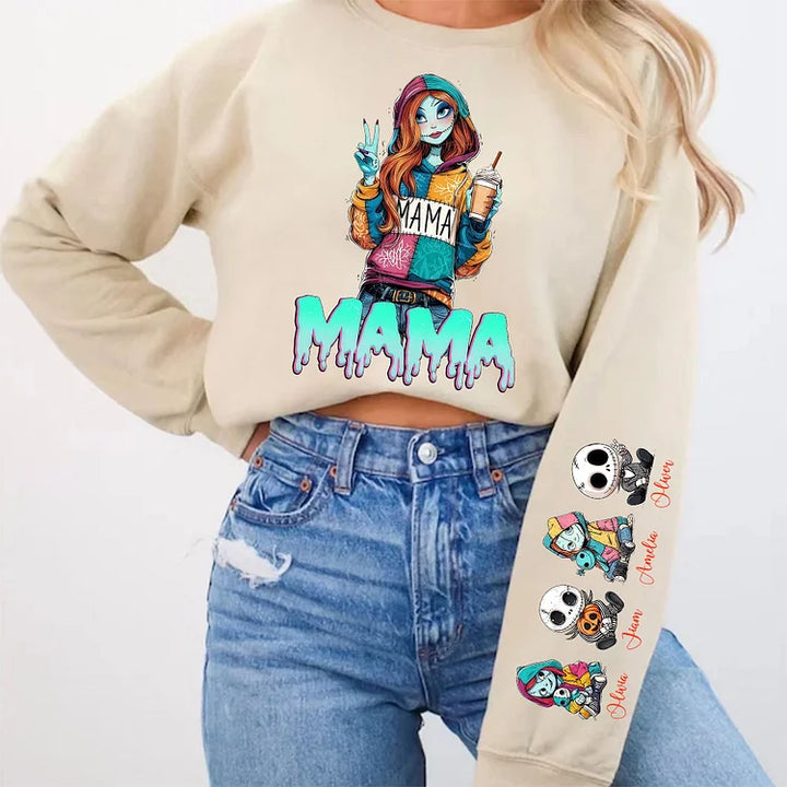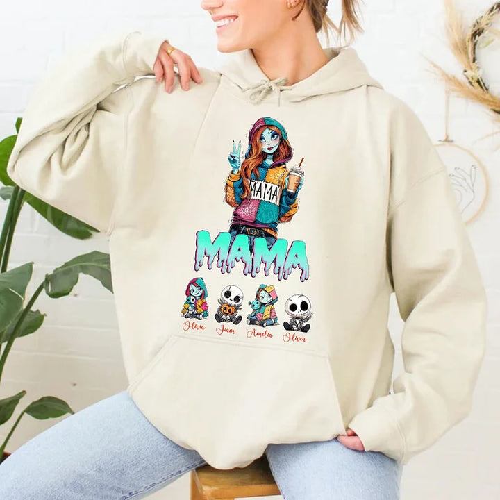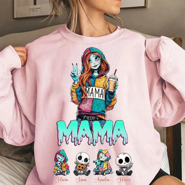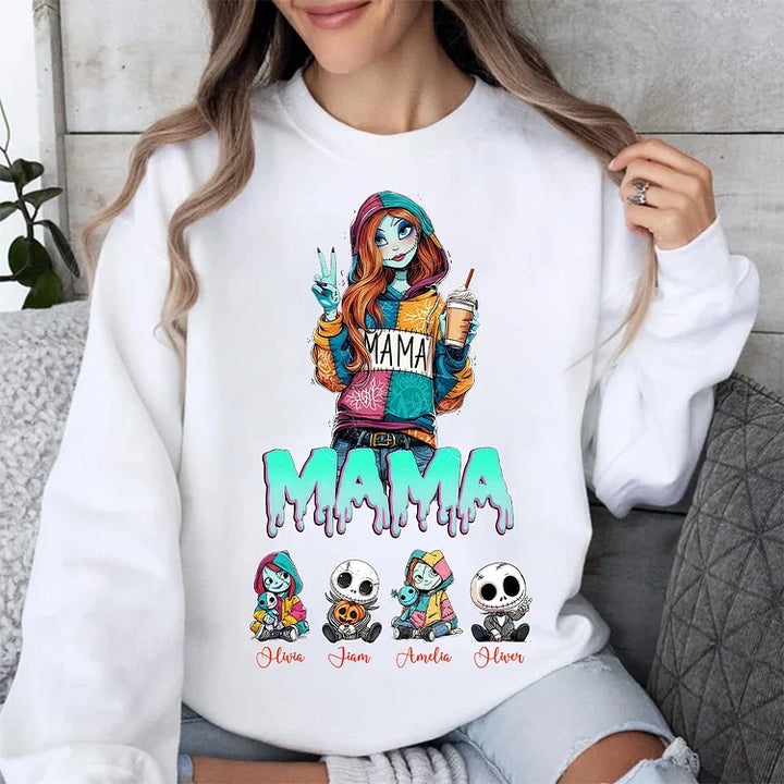 This cozy sweatshirt features a playful âSpooky Mamaâ graphic with colorful Halloween-inspired art. What makes it extra special? You can personalize it with your kidsâ names on the chest or sleeve, along with adorable skeleton characters. Itâs a unique blend of family love, festive spirit, and everyday comfort.