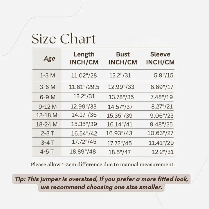 Available for newborns to toddlers (0–5 years). The sweaters are slightly roomy for layering over onesies or shirts—perfect for chilly winter days.