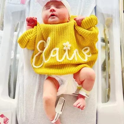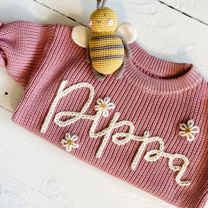 Add your baby's name (up to 10 letters) and choose your favorite thread color to make it truly unique. Each sweater is handmade to order, so every piece is as special as your child.