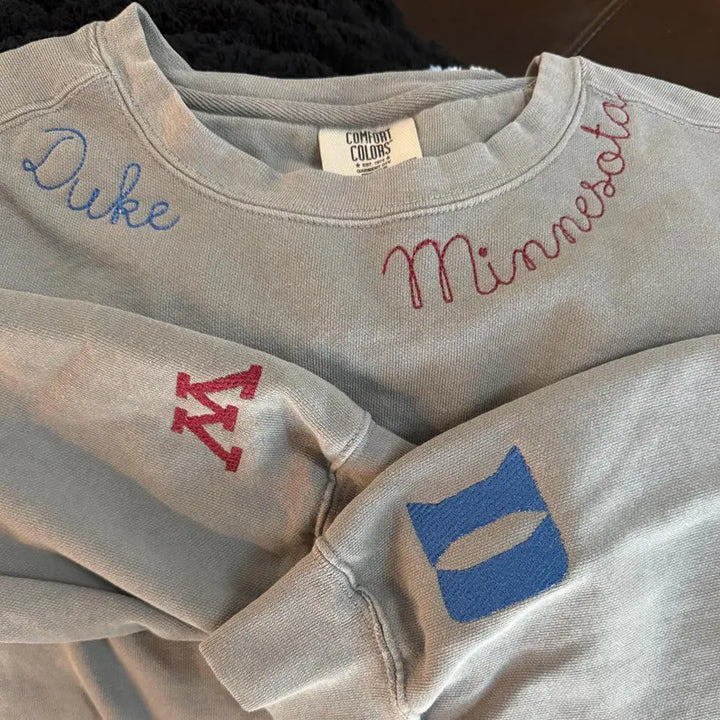 Transform game day passion into year-round pride. This premium crewneck features your school mascot embroidered over the heart with intricate detail, paired with a signature embroidered collar for a polished twist on classic spirit wear.