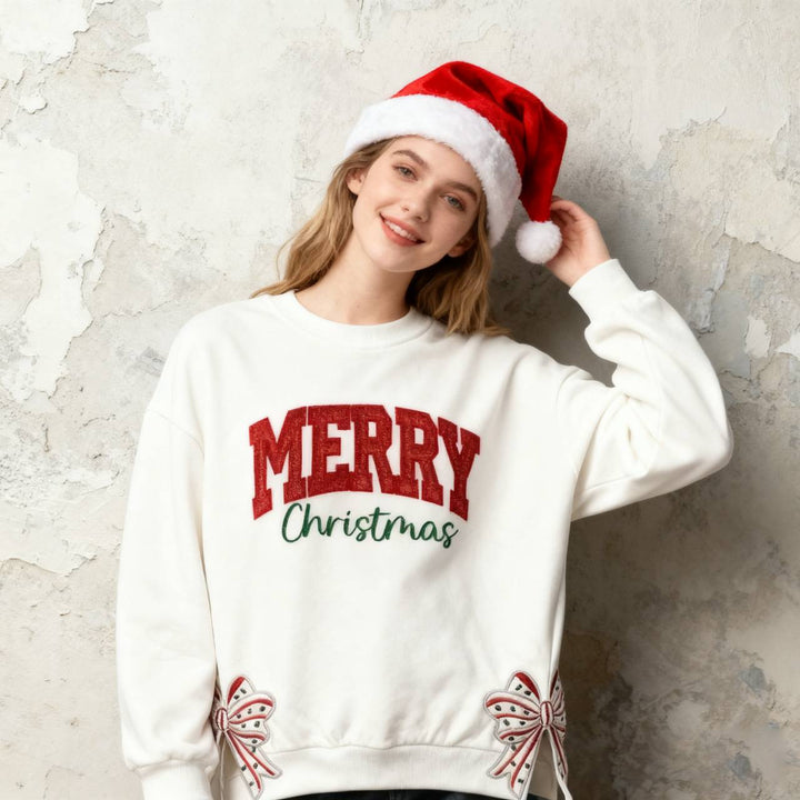 Custom Merry Christmas Glitter Sweatshirt with Bow, Holiday Outfit for Women