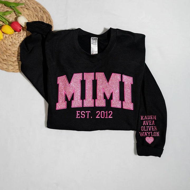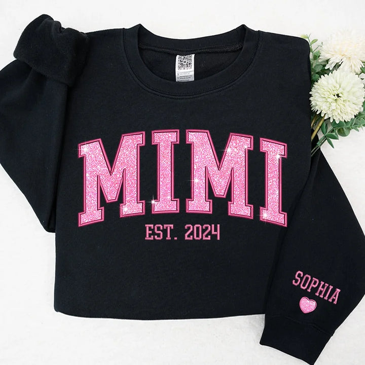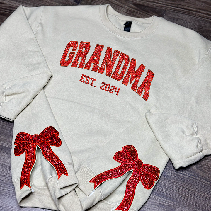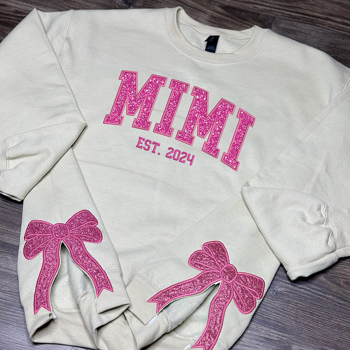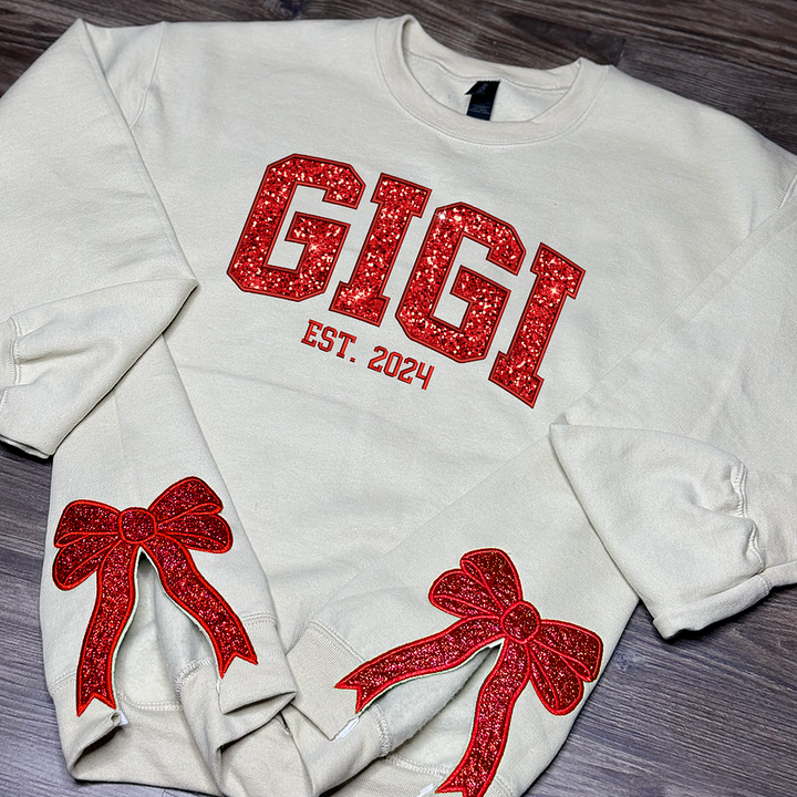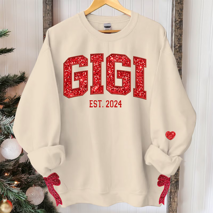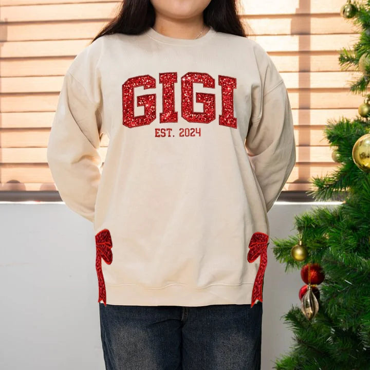 Custom Name Glitter Gigi Est Embroidered Mimi, Grandma Christmas Bow Embellished Sweatshirt