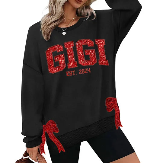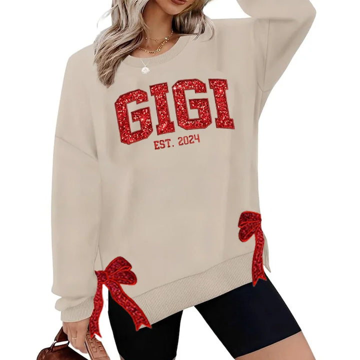 🎀Custom Name Glitter Gigi Est Embroidered Mimi, Grandma Christmas Bow Embellished Sweatshirt – Custom Side Bow Cut-Out Sweatshirt🎀