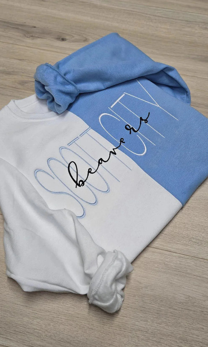 ⨠Stand out in Embroidered and style with our Glittered Split Sweatshirtācustom-made for those who love a bold, personalized look. Choose two sweatshirt colors, two glitter shades, and up to four free sleeve details to make it uniquely yours. Perfect for game days, spirit wear, or just showing off your personality.