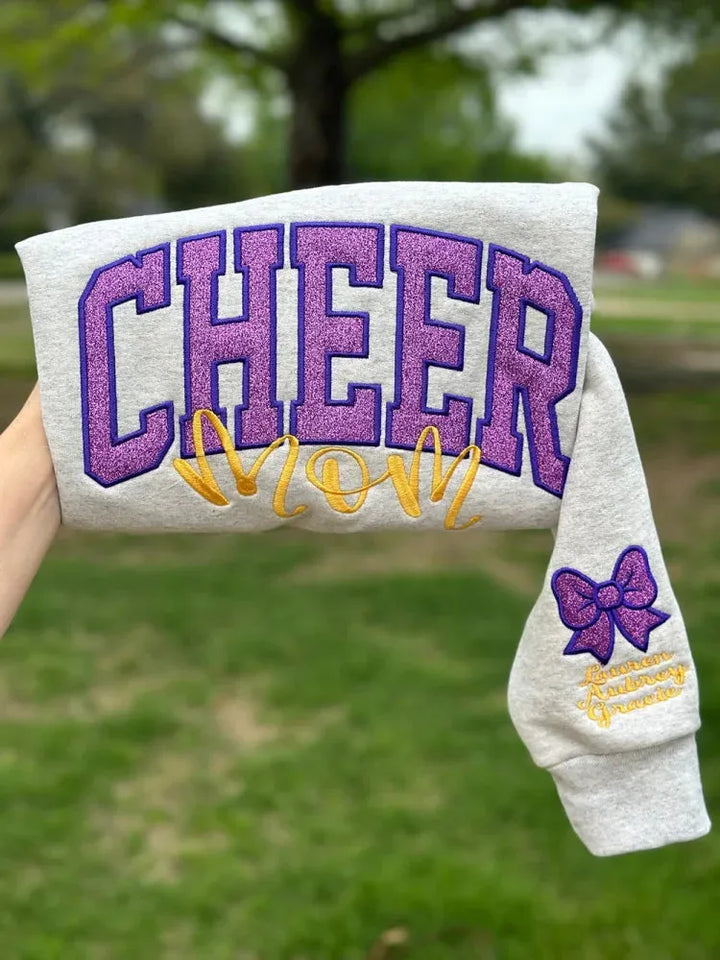 Embroidered Glitter Cheer Mom Sweatshirt With Kids Names On The Sleeve