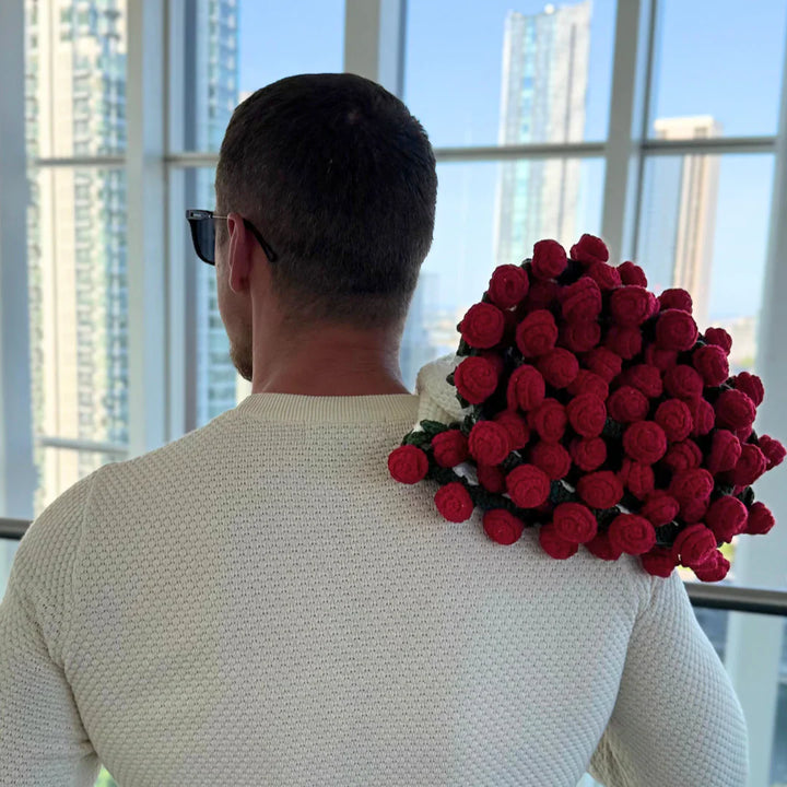 This blanket is the finished version of a popular crochet kit — beautifully crafted, rolled into a rose bouquet, and ready to give.