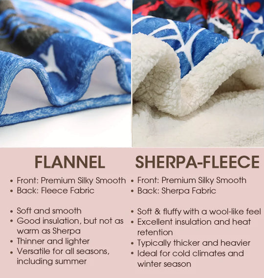 💦There are 2 material options - Flannel and Sherpa-Fleece. Choose the material that fits your purpose.