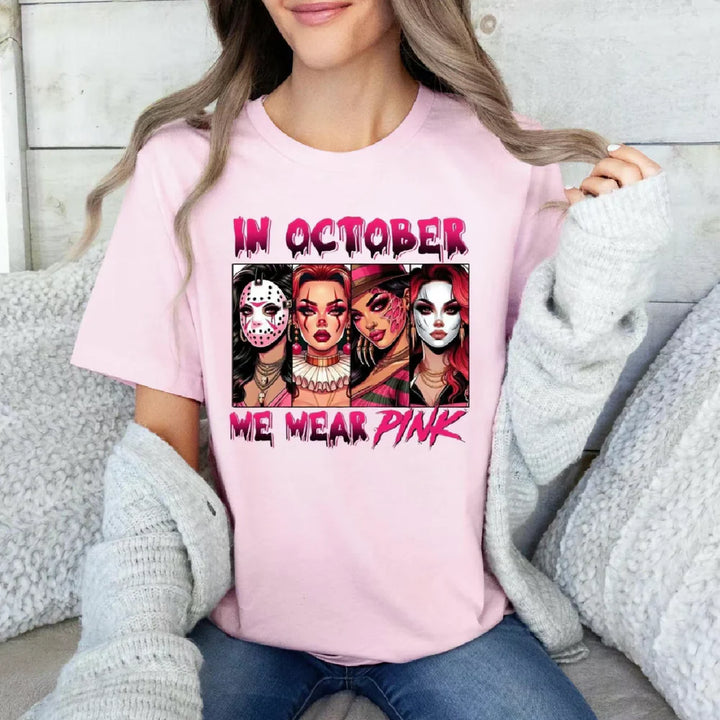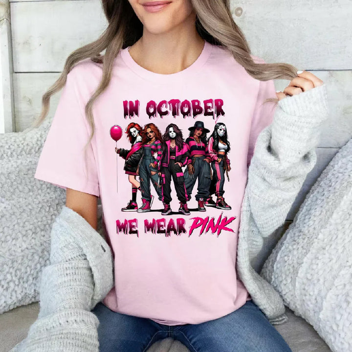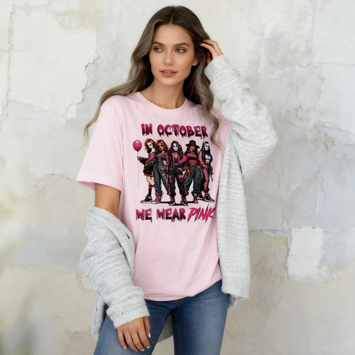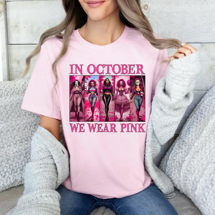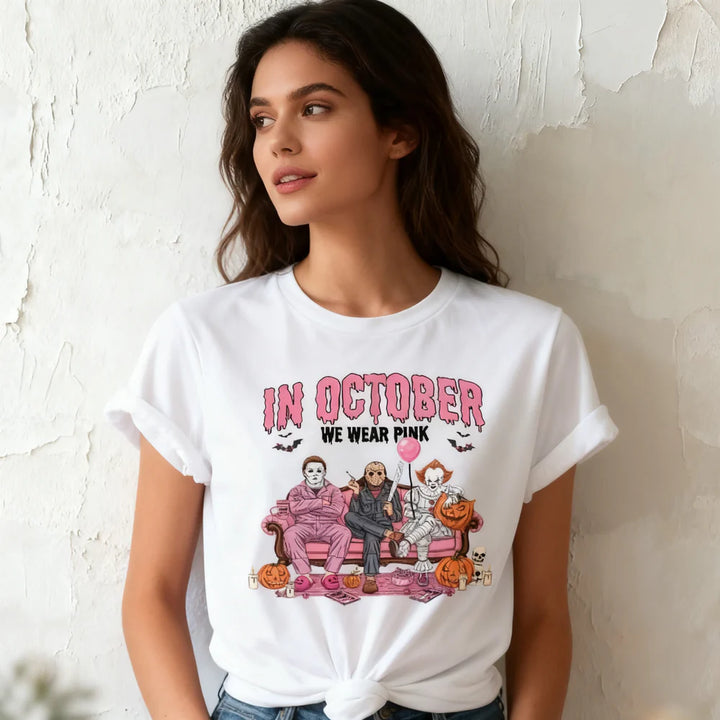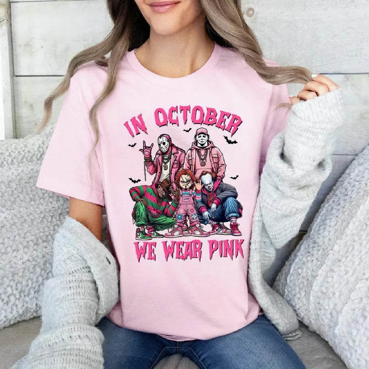 This October, make a statement that’s equal parts powerful and playful. Introducing the "In October We Wear Pink" collection—a bold tribute to breast cancer awareness, wrapped in classic horror movie style. Whether you’re supporting a cause, celebrating Halloween, or simply rocking a tee with meaning, this design lets you stand strong, spooky, and stylish all at once.