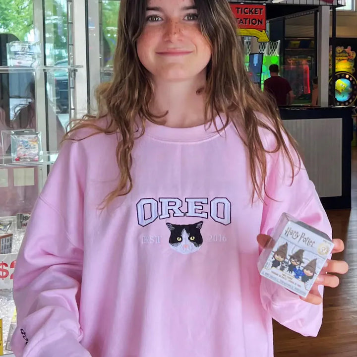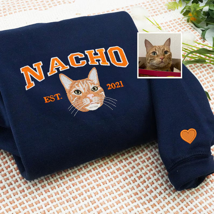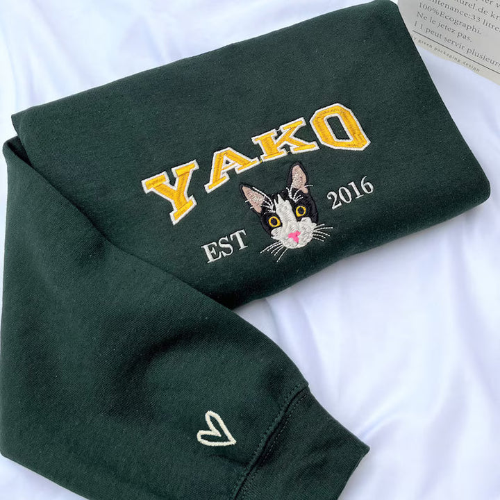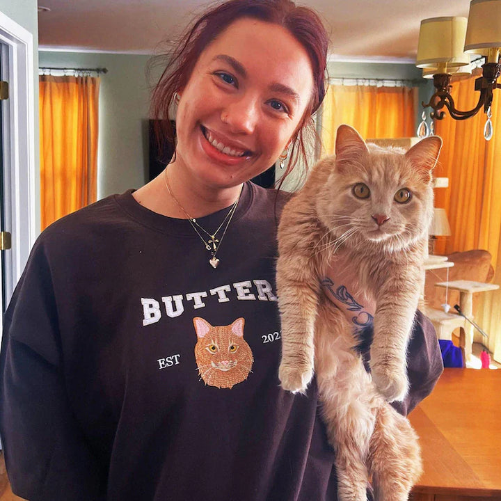 Celebrate your beloved pet with a custom hand-embroidered sweatshirt or T-shirt, where every stitch brings your furry friend's likeness to life!