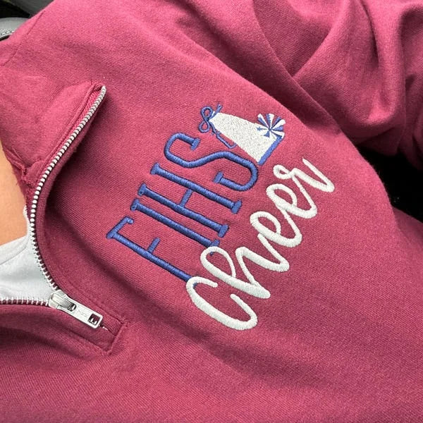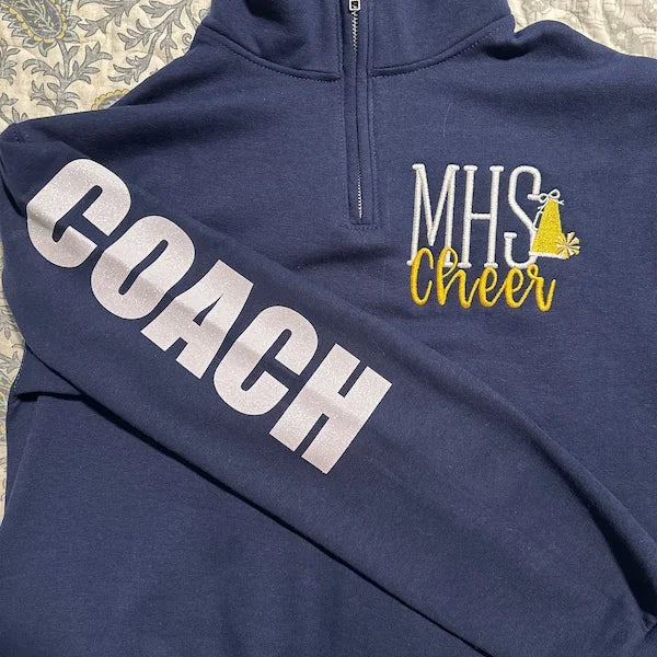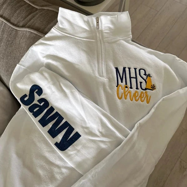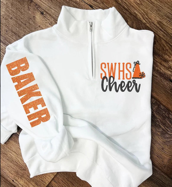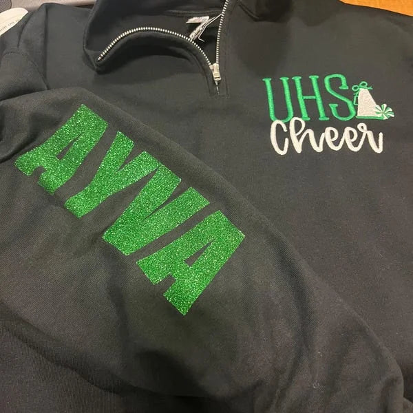 Personalized Cheer Quarter Zip Pullover – Custom Team Abbreviation & Glitter Sleeve Name