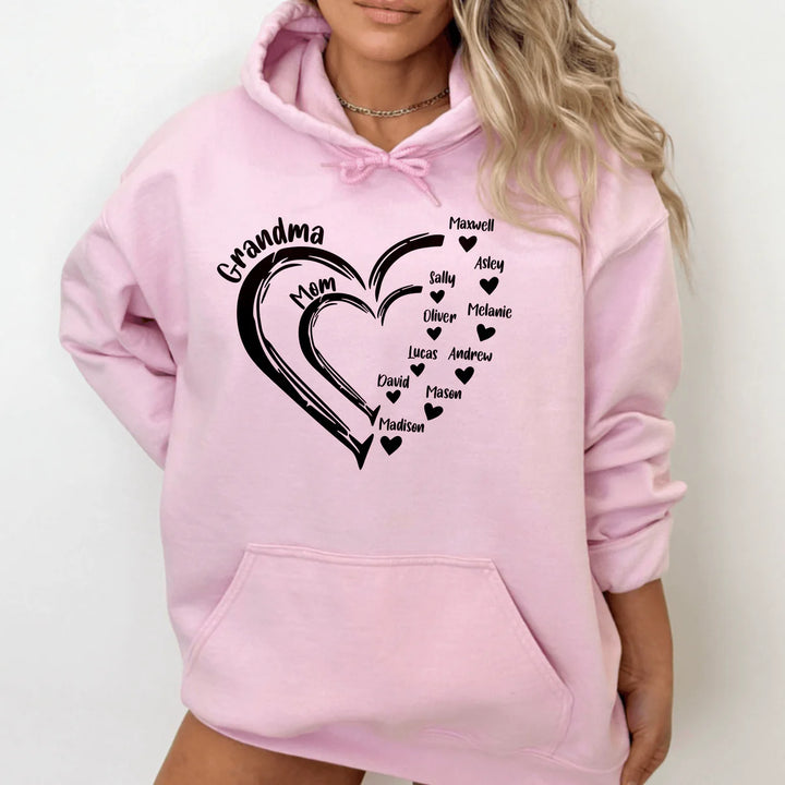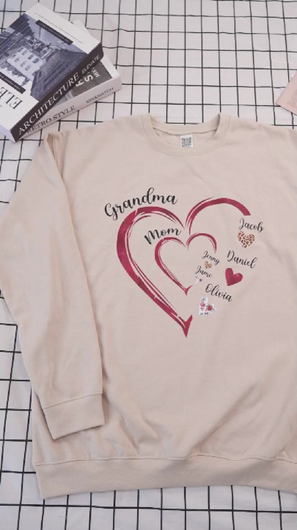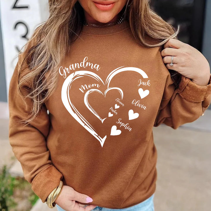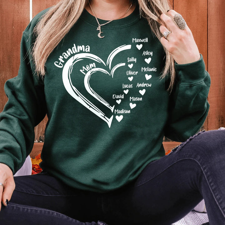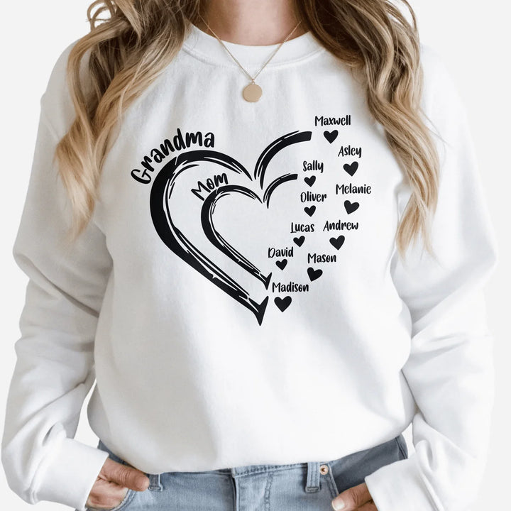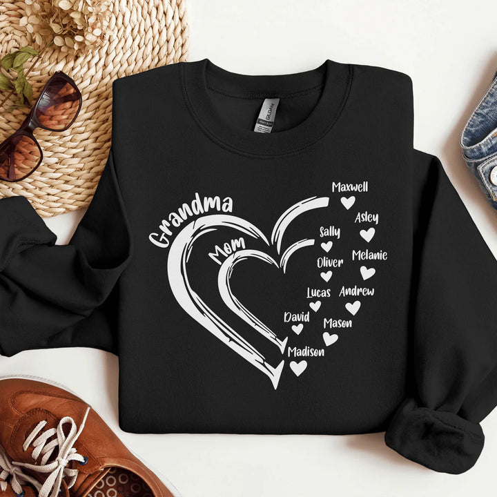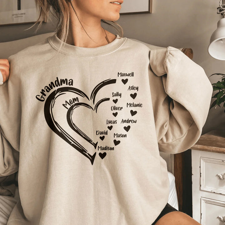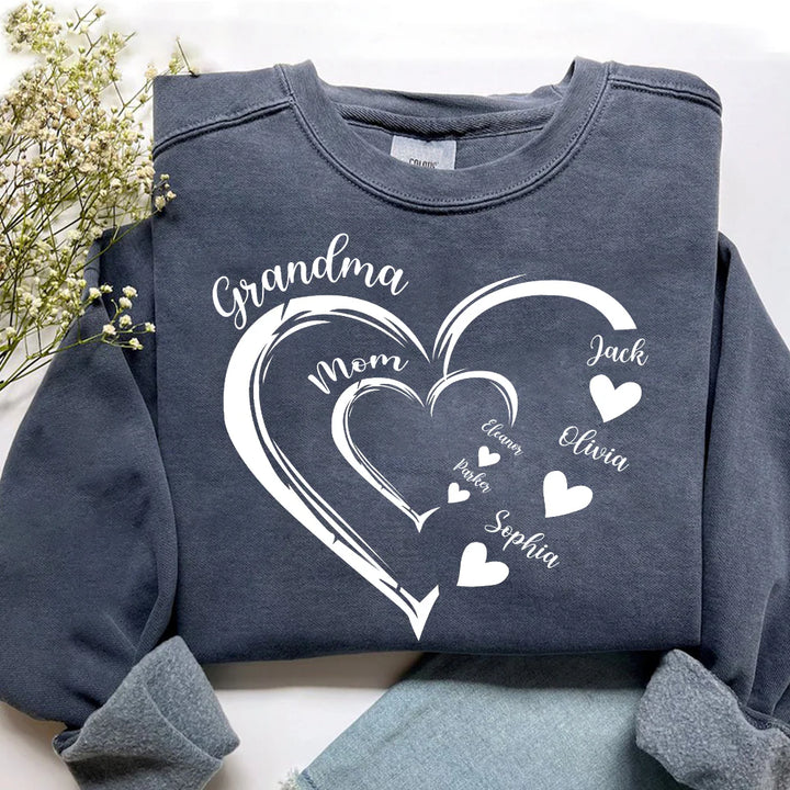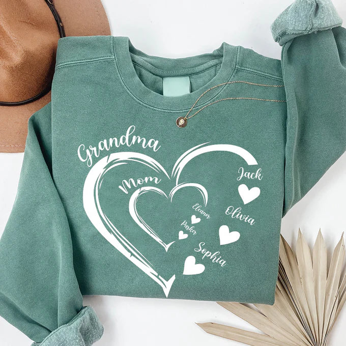 This personalized sweatshirt features a beautiful layered heart graphic with her loving title and the names of her children or grandkids — creating a touching reminder of the ones she holds dear.