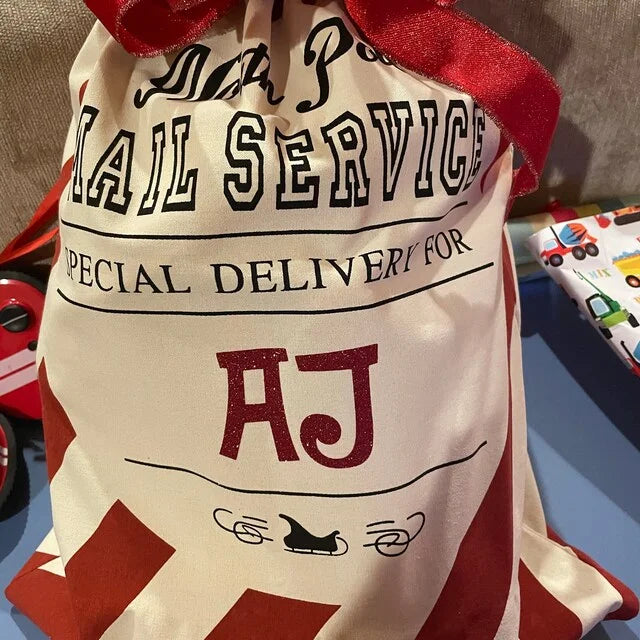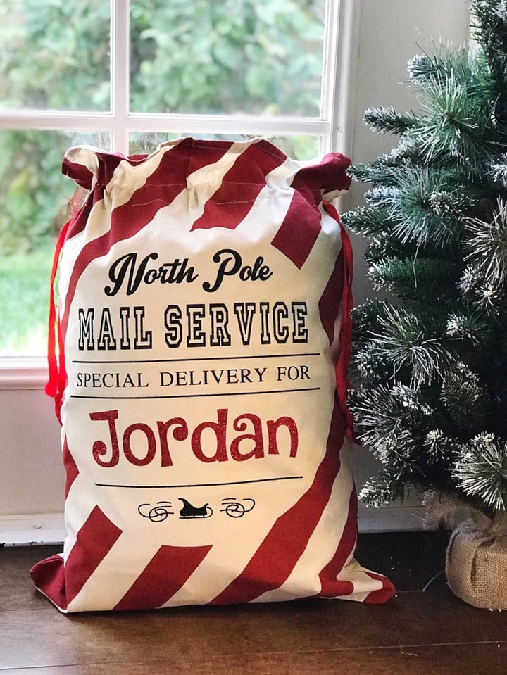 PERSONALIZED SANTA SACK with RED GLITTER WRITING