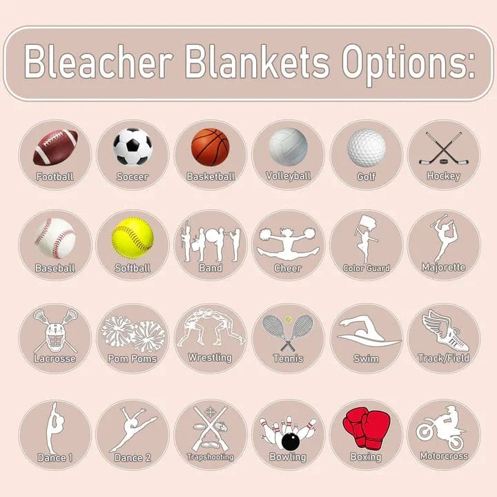 Enjoy your favorite sporting events in comfort with this cozy Bleacher Blanket! Its availble in 5 sizes, 30x40, 40x50, 40x60, 50x60 and 60x80.Ā It's the perfect fit for two, and its personalized design with 11 colors and 24 sports and activities will have you looking snazzy as you snuggle up in the bleachers. Now, that's cheering in style!š