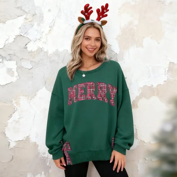 Trendy Merry Side Bow Cut-Out Sweatshirt - Cozy Plaid Christmas Pullover for Women